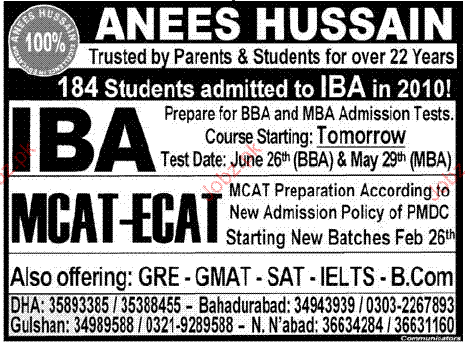 Admission Open in Mcat and Ecat in IBA in Karachi Read newspaper ad for exact details.