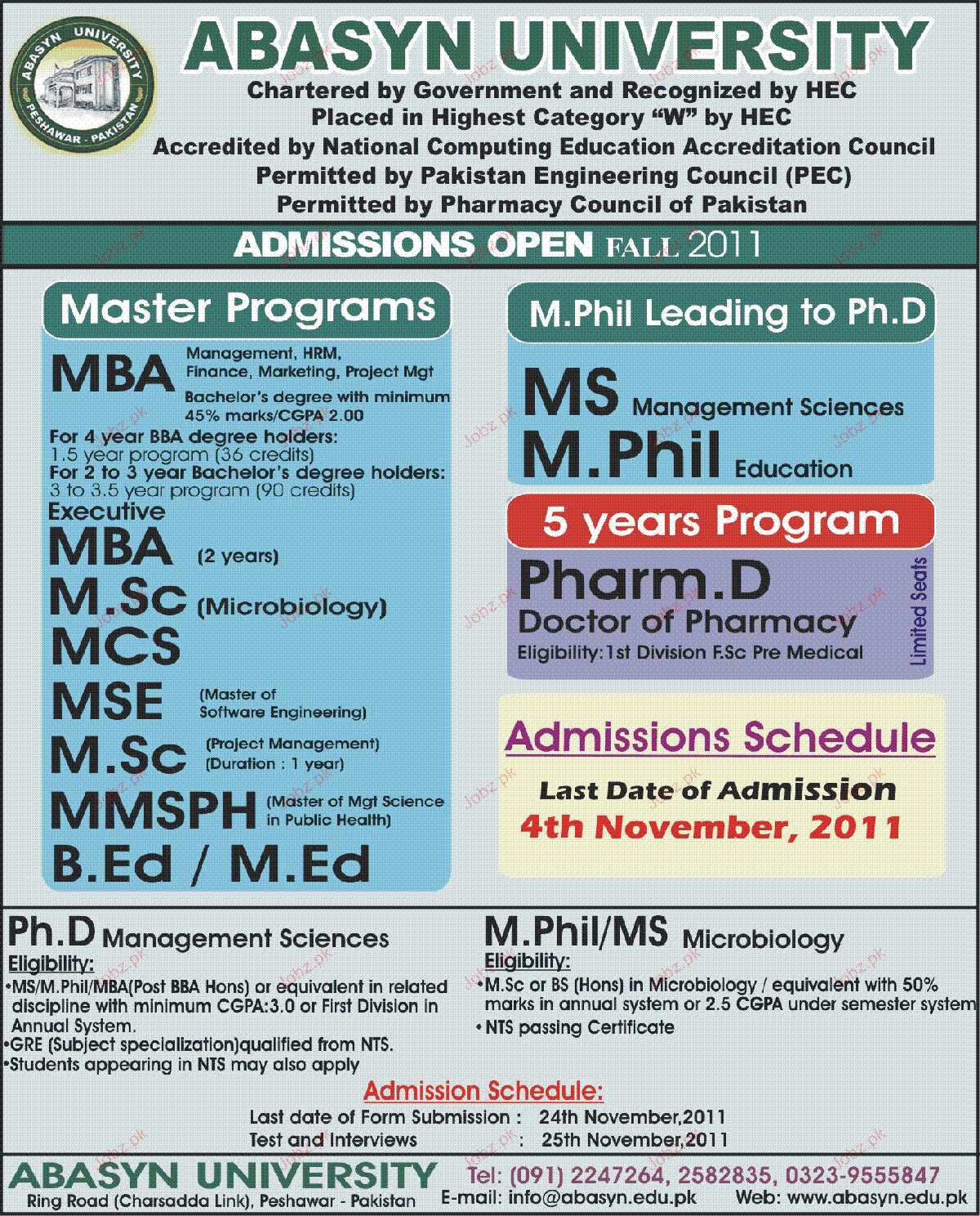 Admission Open in Abasyn University in Peshawar Read newspaper ad for exact details.