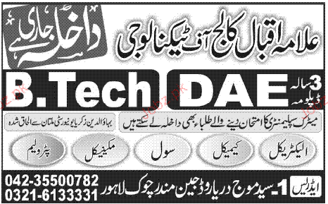Admission Open in Allama Iqbal College of Technology in Lahore Read newspaper ad for exact details.