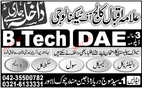 Admission Open in Allama Iqbal College of Technology in Lahore Read newspaper ad for exact details.