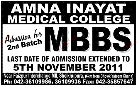 Admission Open in Amna Inyat Medical College in Lahore Read newspaper ad for exact details.