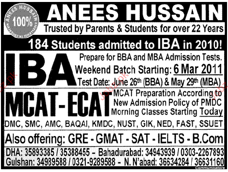 Admission Open in MCAT and ECAT in Anees Hussain Center karachi Read newspaper ad for exact details.