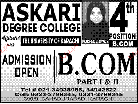 Admission Open in B.Com Askari Degree College in Karachi Read newspaper ad for exact details.