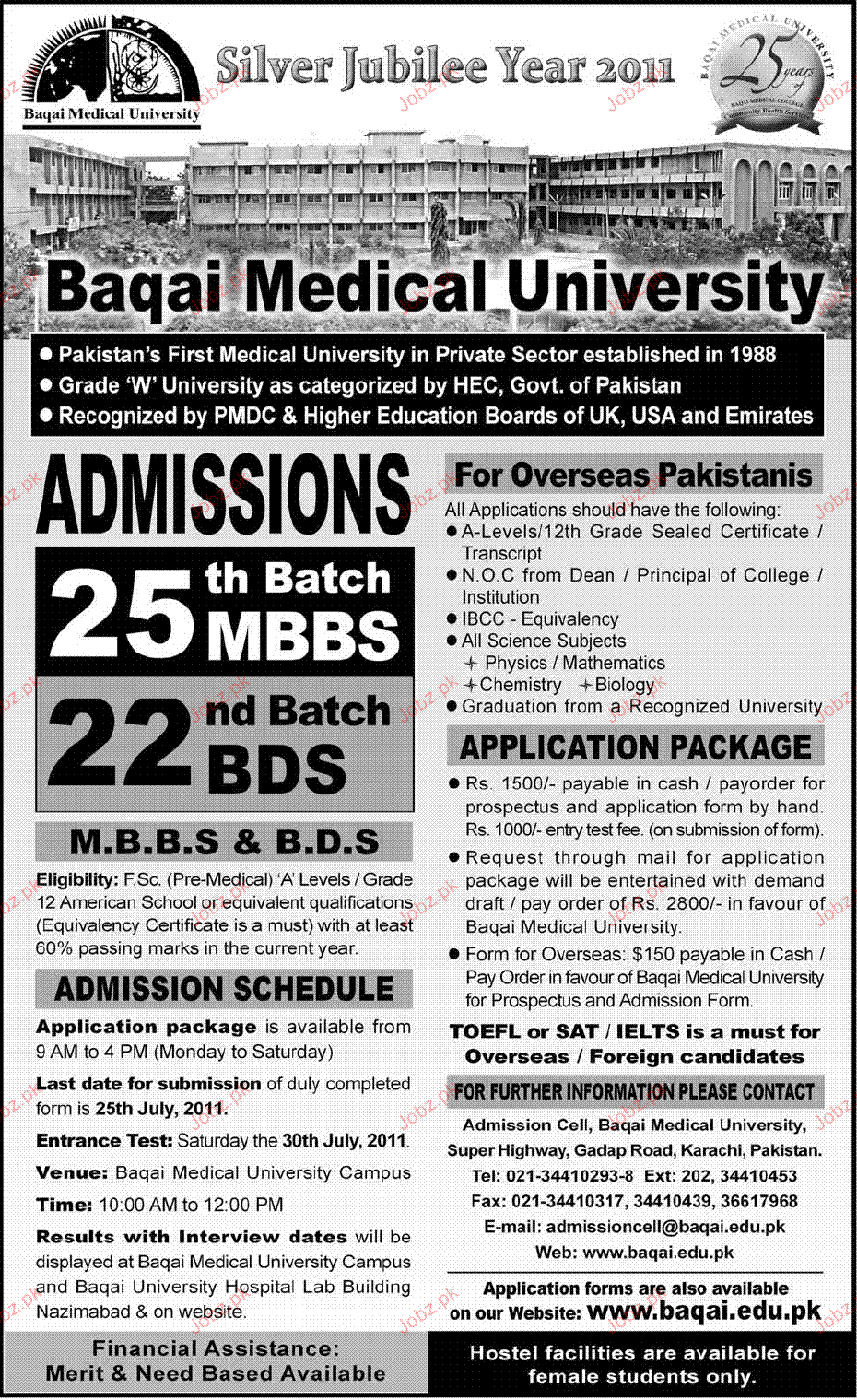 Admission Open in Baqai Medical University in Karachi Read newspaper ad for exact details.