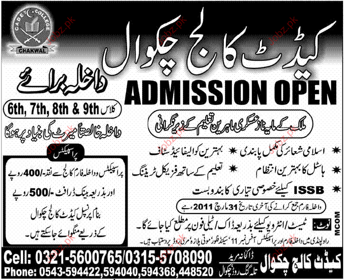 Admission Open in Class VI to IX in Cadet College Chakwal Read newspaper ad for exact details.