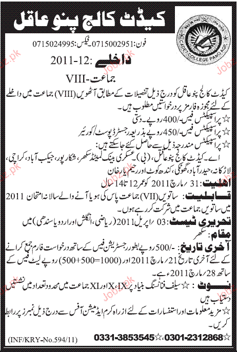Admission Open in Class VIII in Cadet College Puno Aqil Read newspaper ad for exact details.