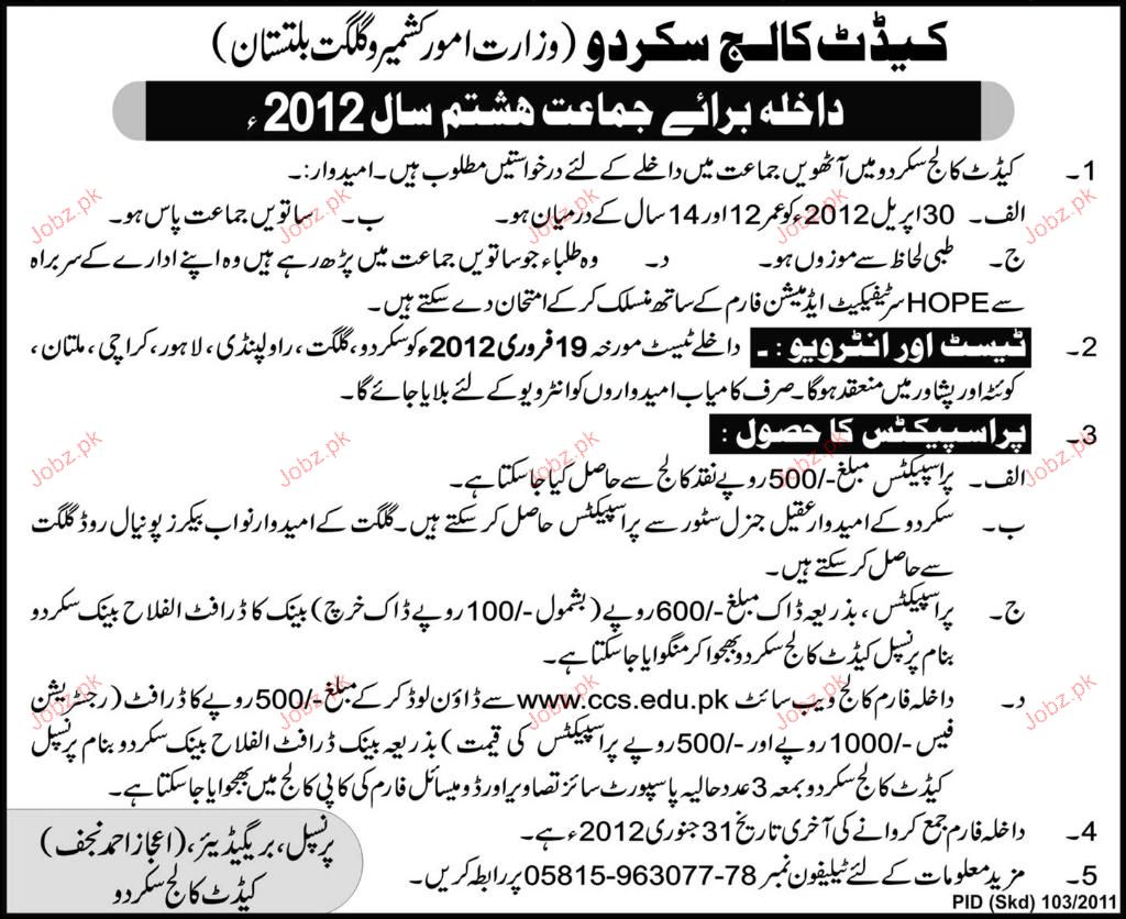 Admission Open in Cadet College Skrdu in Skardu Read newspaper ad for exact details.