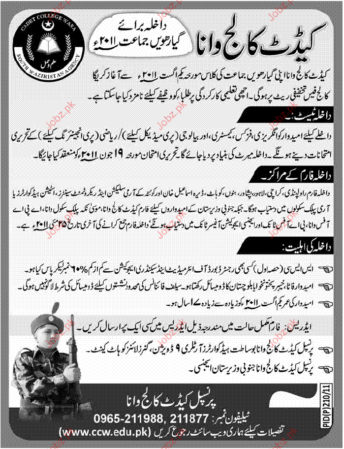 Admission Open in cadet College Wana in Wana Read newspaper ad for exact details.