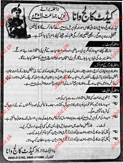 Admission Open in 9th class in Cadet College Wana Read newspaper ad for exact details.