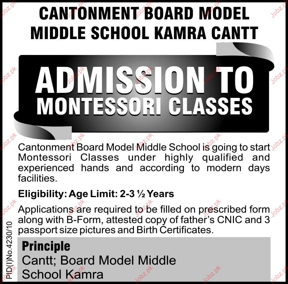 Admission Open in Montessori Classes in Cantonment Board Model Middle School Kamra Read newspaper ad for exact details.