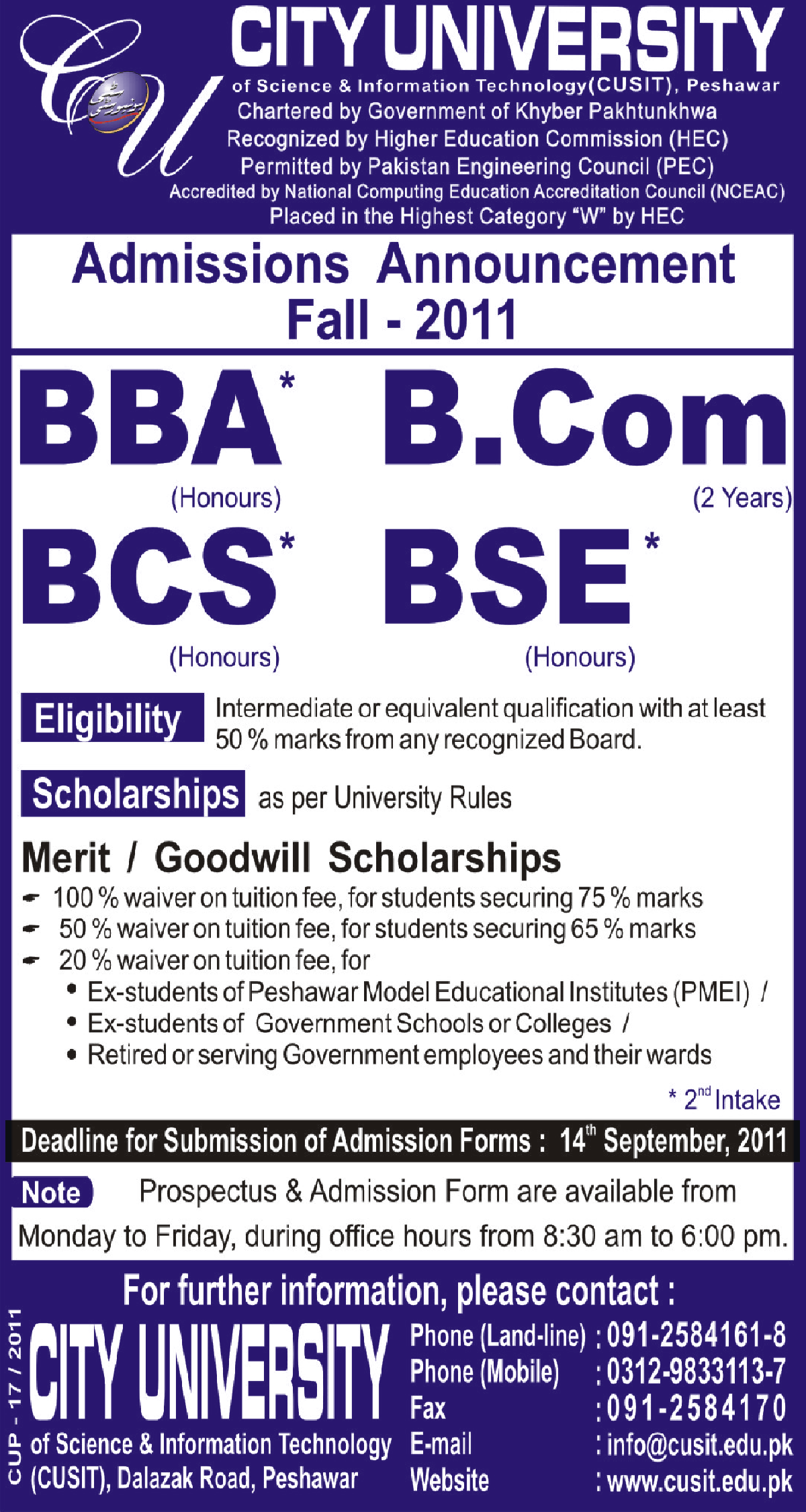 Admission Open in City University of Science & Information in Peshawar Read newspaper ad for exact details.
