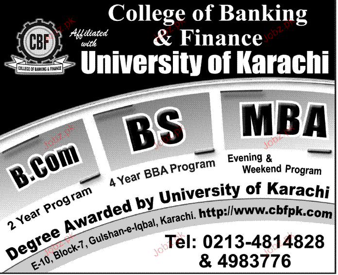 Admission Open in MBA, BS and B.Com in College of Banking & Finance in Karachi Read newspaper ad for exact details.
