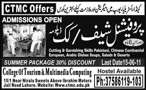Admission Open in College of Tourism & Multimedia Computing in Lahore Read newspaper ad for exact details.