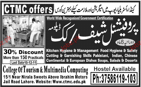 Admission Open in College of Tourism & Multimedia in Lahore Read newspaper ad for exact details.
