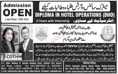 Admission Open in College of Toursim & Hotel Management in Lahore Read newspaper ad for exact details.