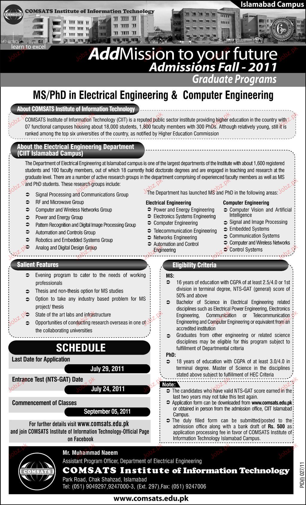 Admission Open in Comsats Institute of Information Technology in Islamabad Read newspaper ad for exact details.