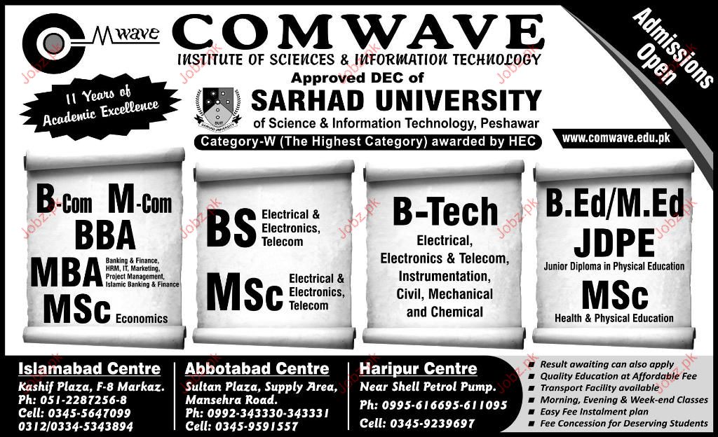 Admission Open in COMWAVE in B.Com, M.Com, BBA, B-Tech, B.Ed, MBA, Msc and M.Ed in COMWAVE in Islamabad Read newspaper ad for exact details.