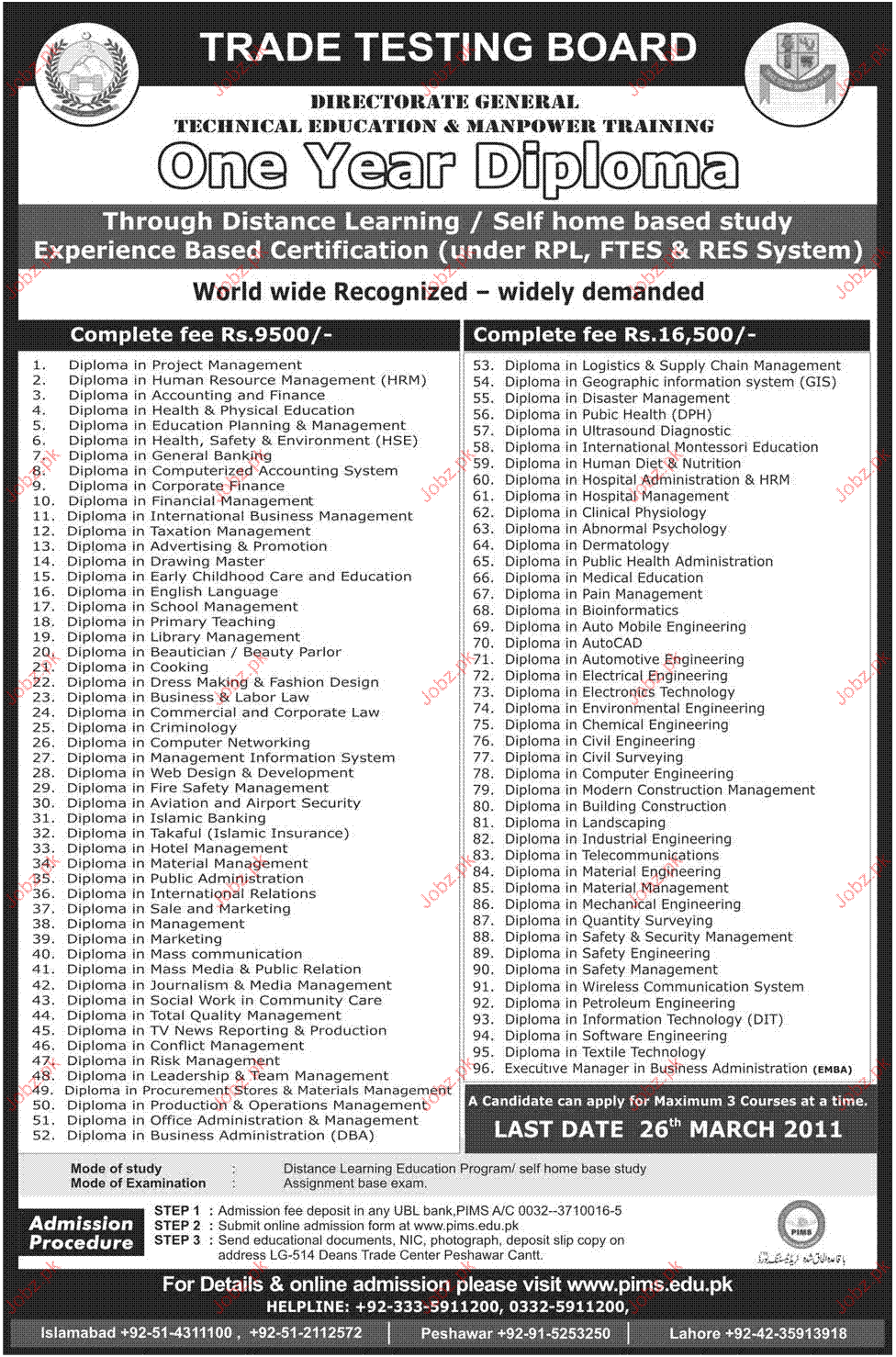Admission Open in Different Technical Diplomas in Directorate General Technical Education in Lahore Read newspaper ad for exact details.