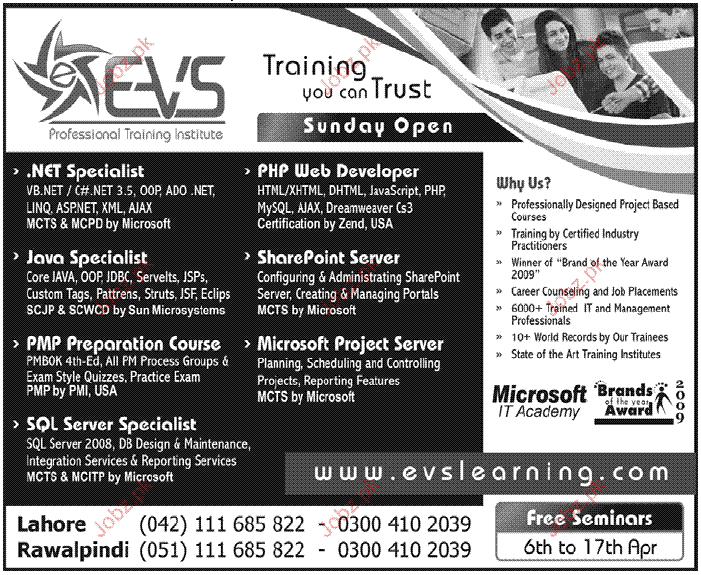 Admission Open in Different Computer Courses in EVS Professional Training Institute in Rawalpindi Read newspaper ad for exact details.
