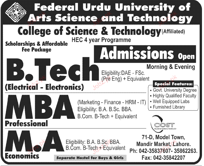 Admission Open in Federal urdu University of Arts Science in Lahore Read newspaper ad for exact details.