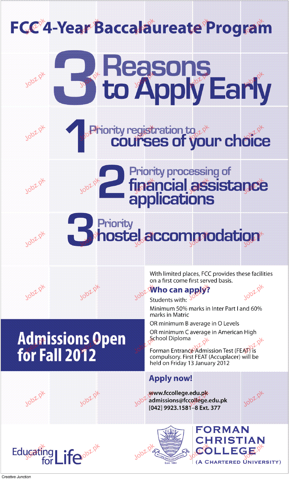 Admission Open in FCC-4 Year Baccalaureate Program in Forman Christian College in Lahore Read newspaper ad for exact details.