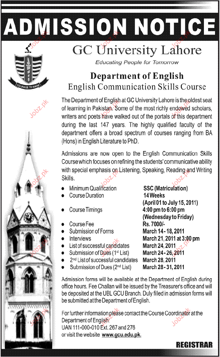 Admission Open in English Communication Skills Course in GC University Lahore Read newspaper ad for exact details.