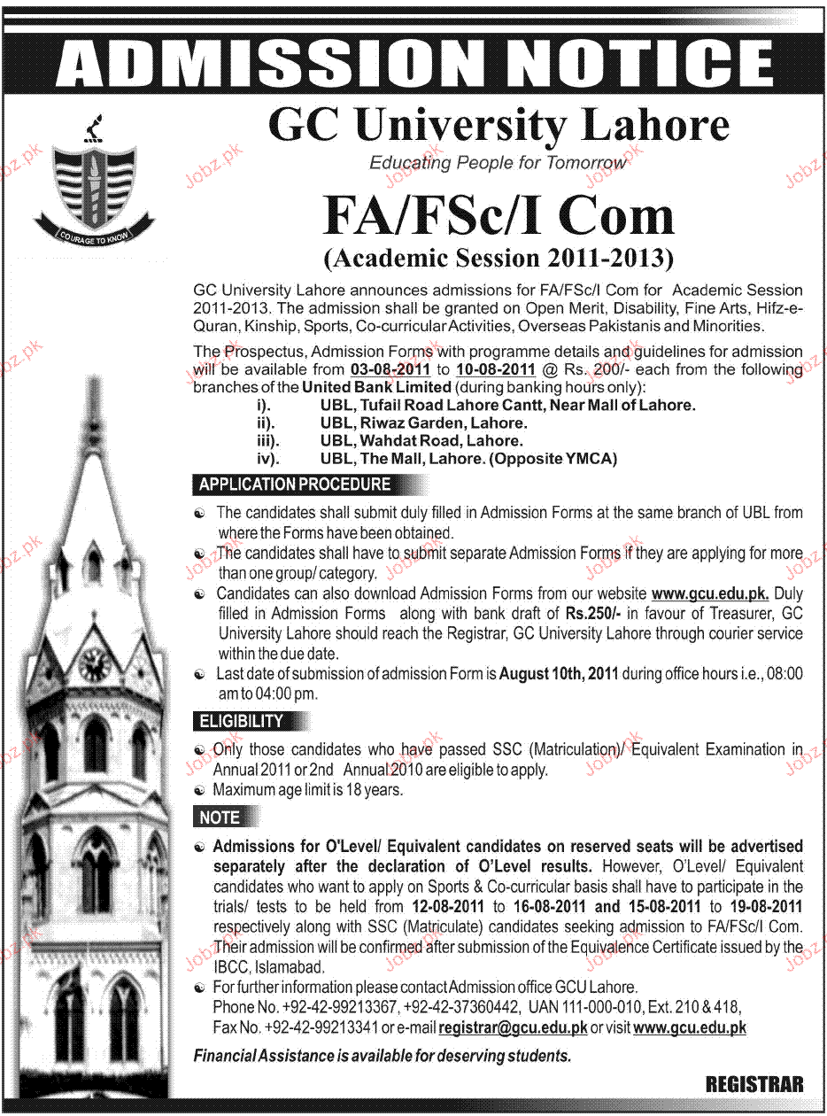 Admission Open in GC University in Lahore Read newspaper ad for exact details.
