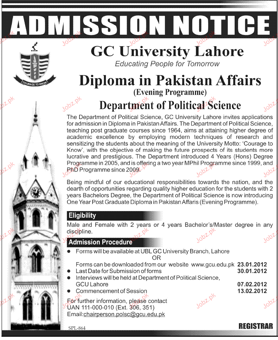 Admission Open in Diploma in Pakistan Affairs in GC University in Lahore Read newspaper ad for exact details.