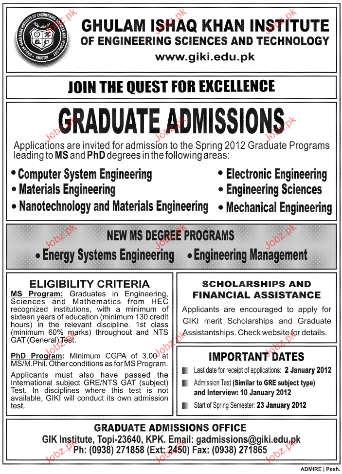 Admission Open in Ghulam Ishaq Khan Institute of Engineer in Swabi Read newspaper ad for exact details.