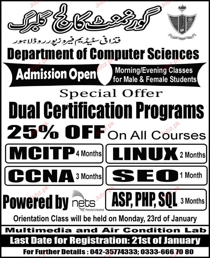 Admission Open in MCITP, CCNA, LINUX and SEO in Government College Gulberg in Lahore Read newspaper ad for exact details.