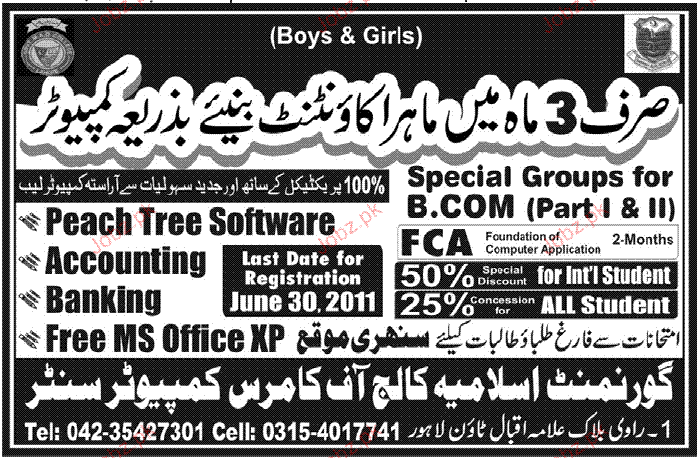 Admission Open in Govt College of Islamia College of Commerc in Lahore Read newspaper ad for exact details.