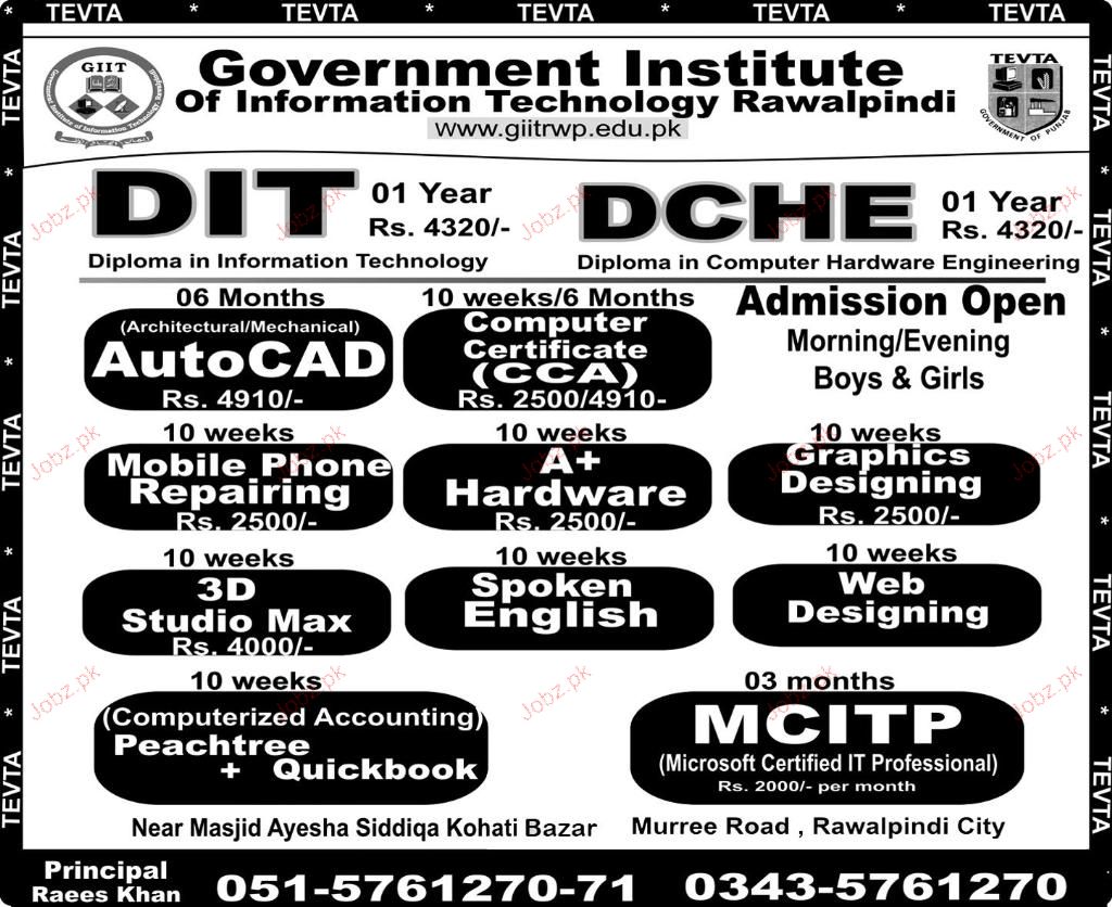 Admission Open in Govt Institute of Information Technology in Rawalpindi Read newspaper ad for exact details.