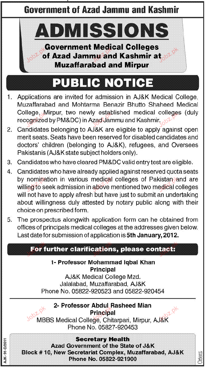 Admission Open in Govt Medical College of AJK in Muzaffarabad Read newspaper ad for exact details.