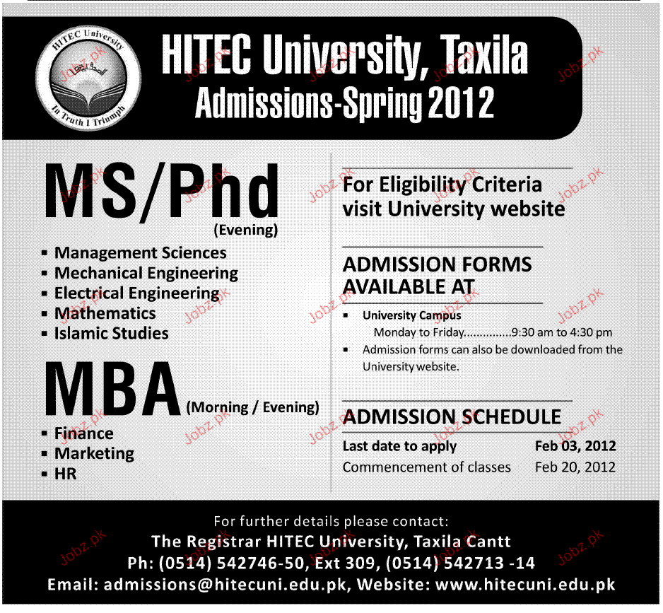 Admission Open in Phd and MBA in HITEC University, Taxila Read newspaper ad for exact details.