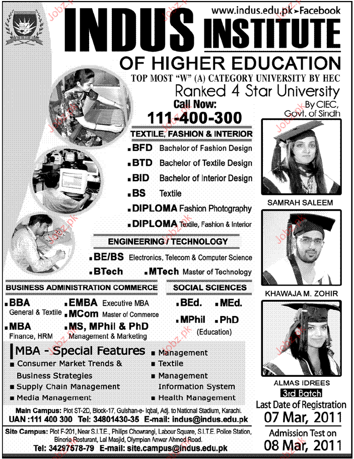 Admission Open in BFD, BTD, BID, BS, BBA, EMBA, BED MED in Indus Institute in Karachi Read newspaper ad for exact details.