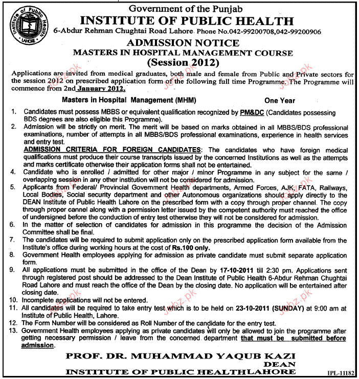 Admission Open in Institute of Public Health in Lahore Read newspaper ad for exact details.