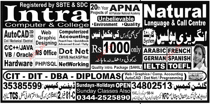 Admission Open in Different Computer Courses in Intra Computer & College in Karachi Read newspaper ad for exact details.