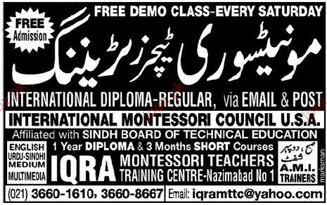 Admission Open in Montesssori Teacher and Training in Iqra Montessori Teacher Training Centre in Karachi Read newspaper ad for exact details.