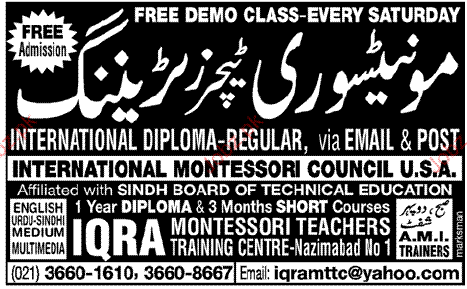 Admission Open in Diploma in Montessori in Iqra Montessori Teacher Training Centre in Karachi Read newspaper ad for exact details.