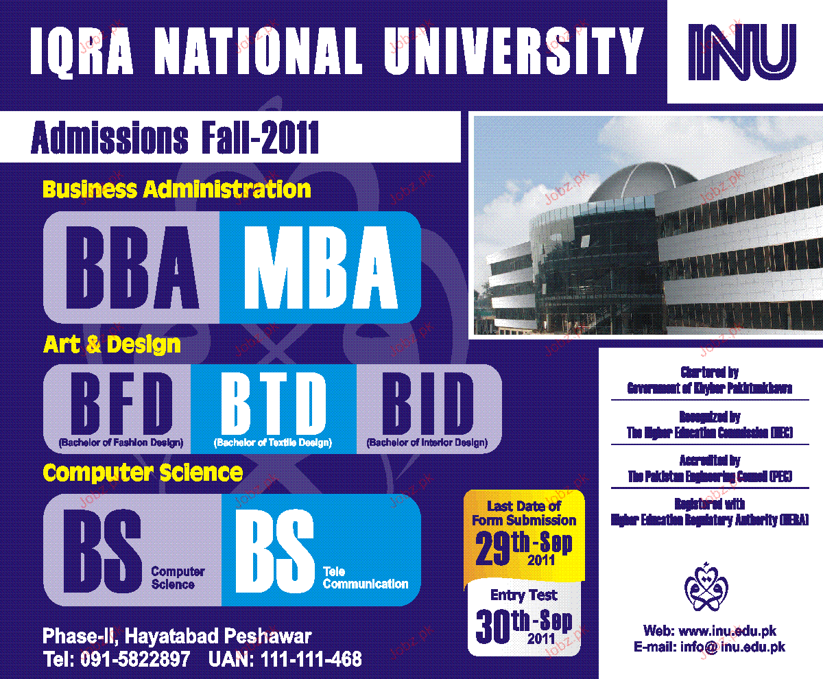 Admission Open in Iqra National University in Peshawar Read newspaper ad for exact details.