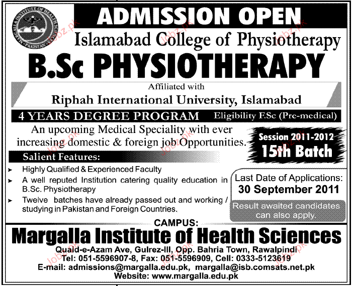 Admission open in Islamabad College of Physiotherapy in Islamabad Read newspaper ad for exact details.