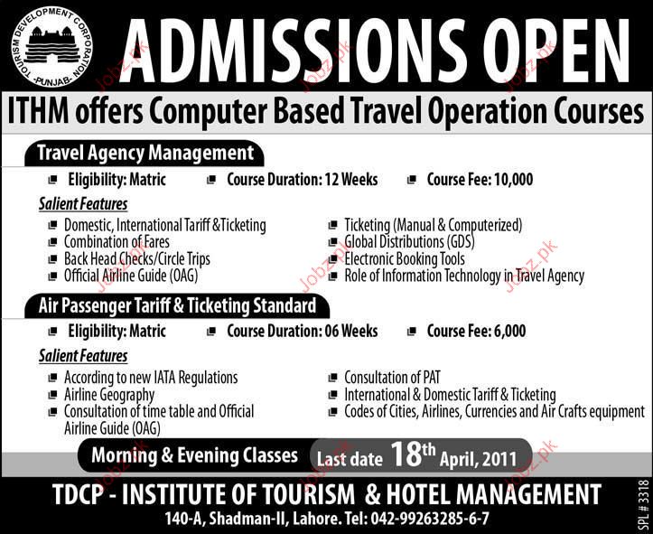 Admission Open in course in TDCP - Institute of tourism & Hotel Management in Lahore Read newspaper ad for exact details.