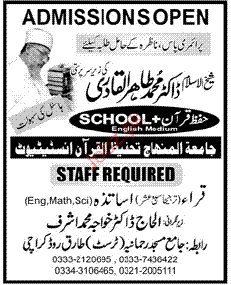 Admission Open in Jamia Minhaj Tahfiz Ul Quran in Karachi Read newspaper ad for exact details.