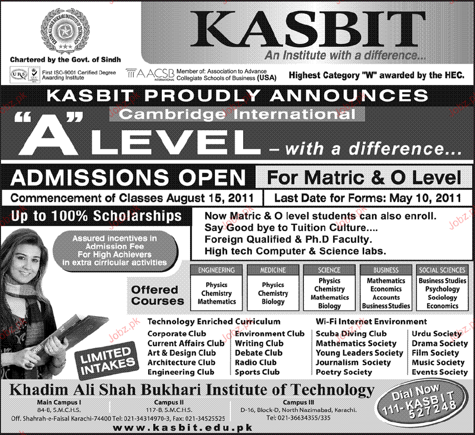 Admission Open in Matric and O Level in KBSBIT in Karachi Read newspaper ad for exact details.