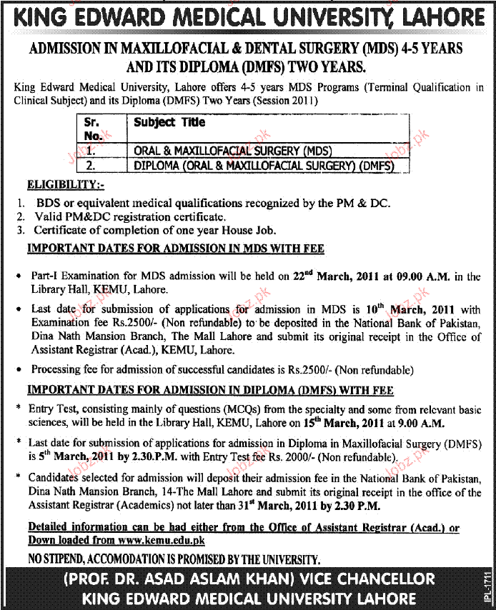 Admission Open in Maxillofacial, Dental Surgery and ITs Diploma in King Edward Medical University Lahore Read newspaper ad for exact details.