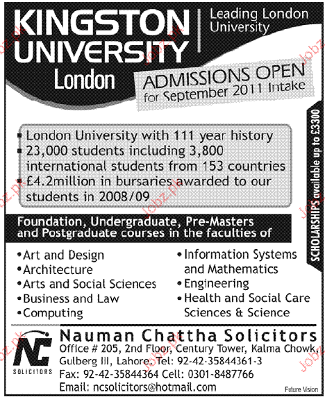 Admission Open in Different undergraduate Programs in Kingston University London in London Read newspaper ad for exact details.