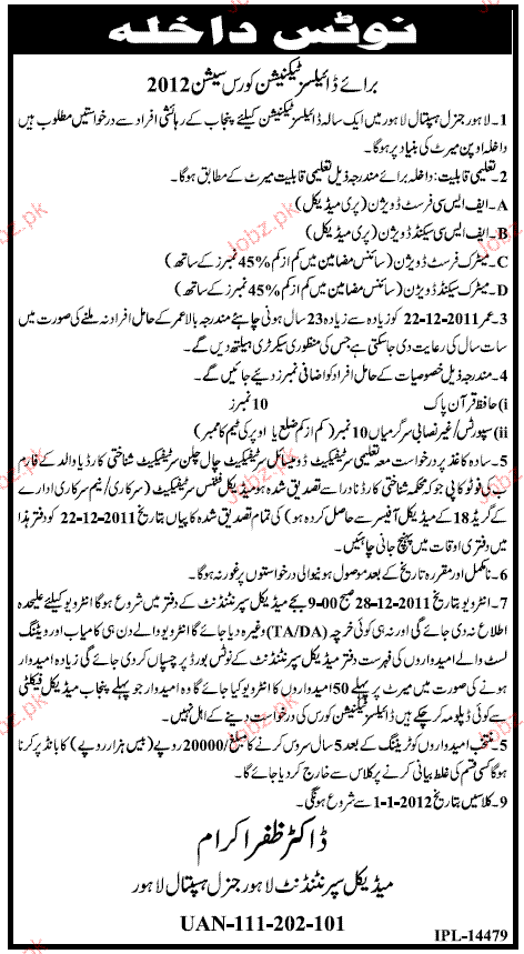 Admission Open in Lahore General Hospital in Lahore Read newspaper ad for exact details.