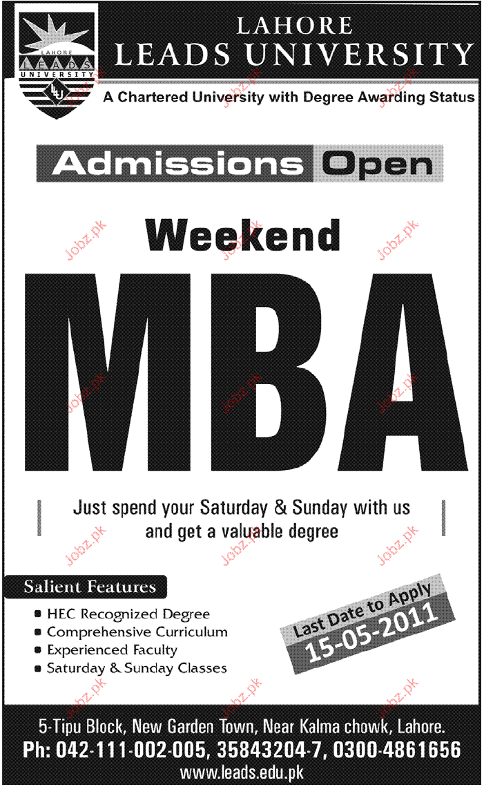 Admission Open in MBA in Leads University in Lahore Read newspaper ad for exact details.