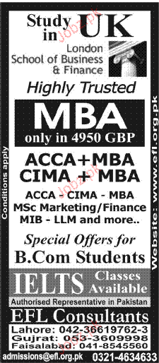 Admission Open in London School of Business & Finance in UK Read newspaper ad for exact details.