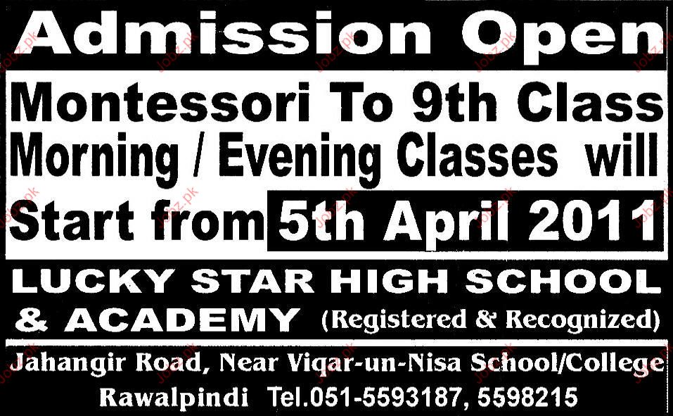 Admission Open in Montessori to IX in Lucky Star High School & Academy in Rawalpindi Read newspaper ad for exact details.